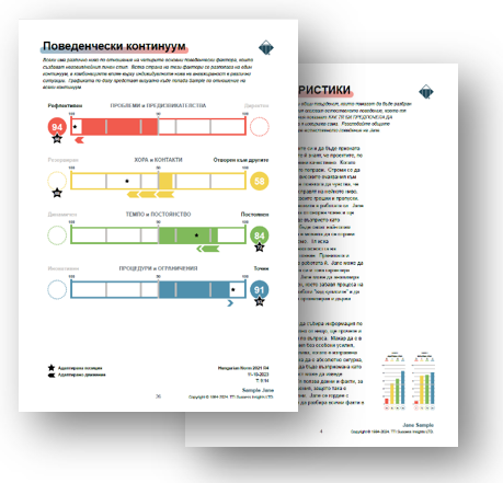 Инструментите на TTI Success Insights, измерващи Поведения/DISC, изследват доминантността, влиянието, постоянството и съобразяването на човек, като показват начините, по които той реагира на: