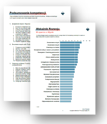 Oceny TTI Success Insights mierzące kompetencje badają poziom rozwoju 23 unikalnych umiejętności osobistych, szeregując je od najlepiej rozwiniętej umiejętności do tej, która wymaga największego poziomu dalszego rozwoju.